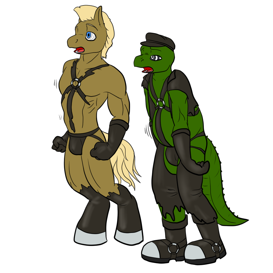 Anonymous slavestream commission. khorax and his horse buddy got into the seminar to find the presentation to be... quite interesting indeed, intoxicating so... They were too tranced to notice their clothes shift and change into tight, shiny leather. Hey look, he got his free hat!