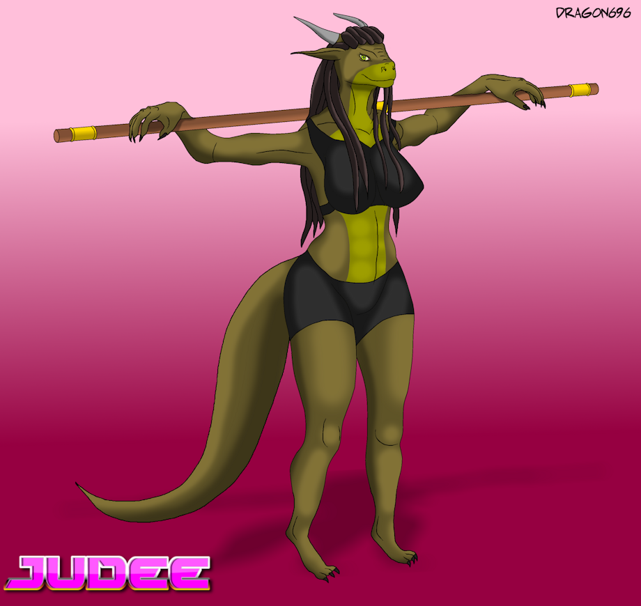 Judees fighting staff is short here but she can extend it by attaching more sections by the ends. Also her staff can give off strong shock force fields to knock out enimies. (via add ons that she screws onto the ends of her staff)