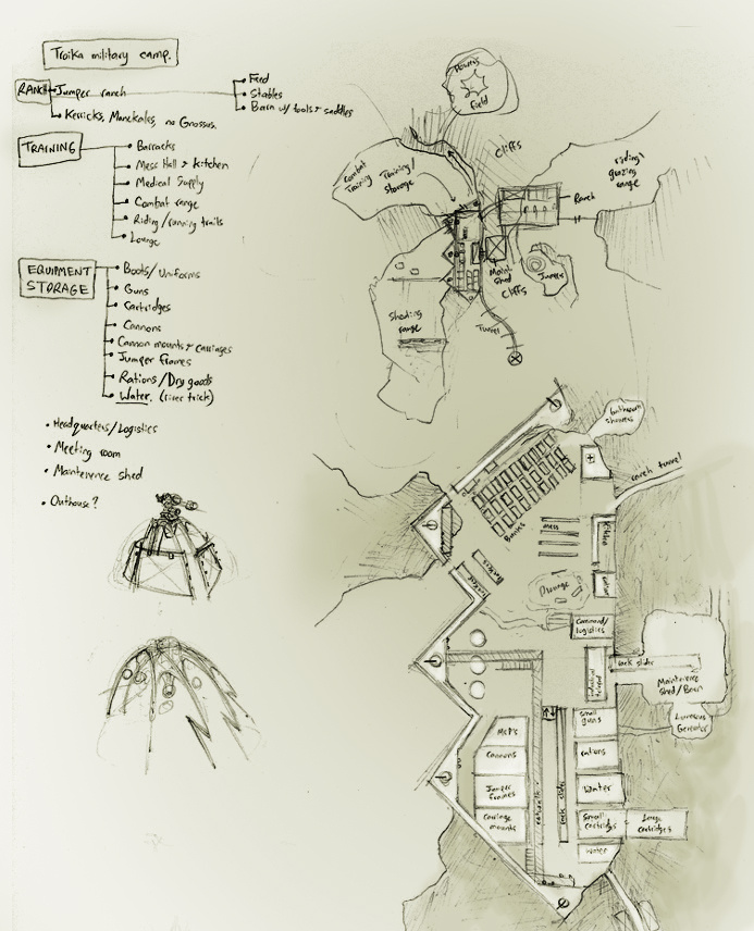 The zig-zag outer wall design is reflective of military emplacements from the days of seige warfare. When the enemy is crowding against the base of a wall using it for cover, the angled wall system allows the defenders to continue pouring fire on them. I also tried to put some thought into a base setup that accomplished the main goals of the installation, one of them being storage... For example (This doesn't come up in the book, but I just thought it was cool) The springer cartridge storage area is flanked by water storage, so in the event of an accidental cartridge discharge, there's a natural barricade minimizing damage to the surrounding areas.