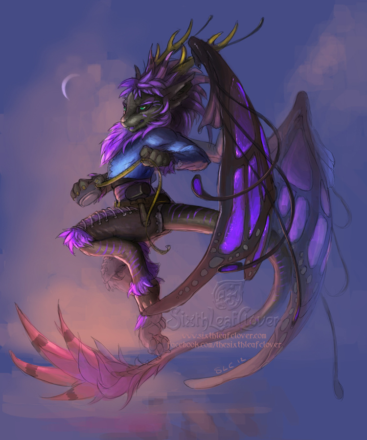 A dragon in like butterfly wings, and an almost feline design. It looks like it is moving among the