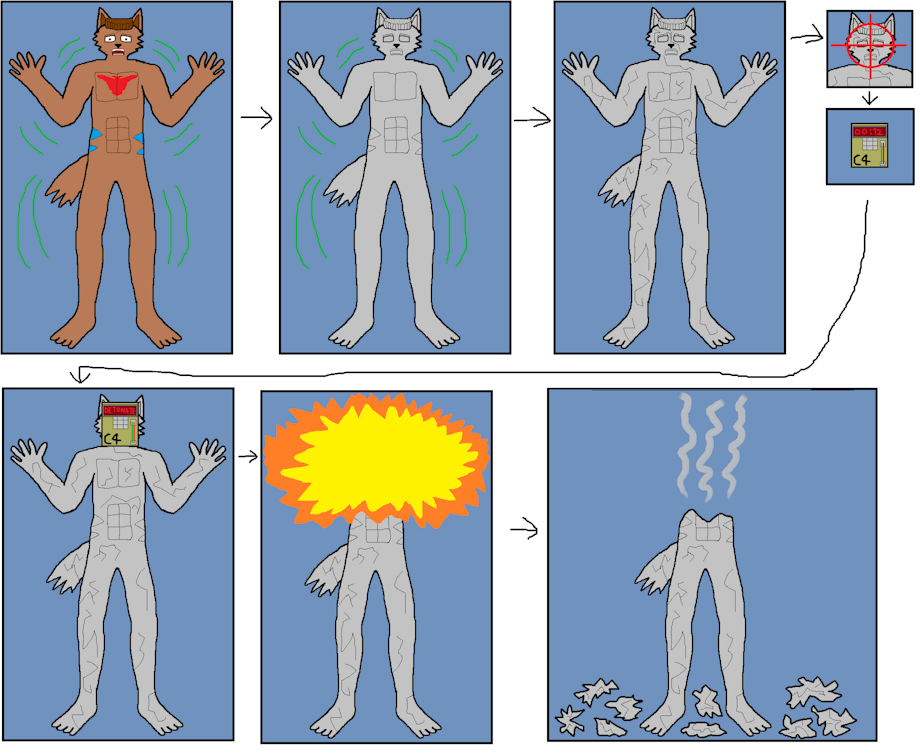 Marco has been fallen victim of petrifaction, now he's a sitting duck, Medusa decides to throw a time bomb on Marco's face to finish him off. BOOM! FATAL KILL!