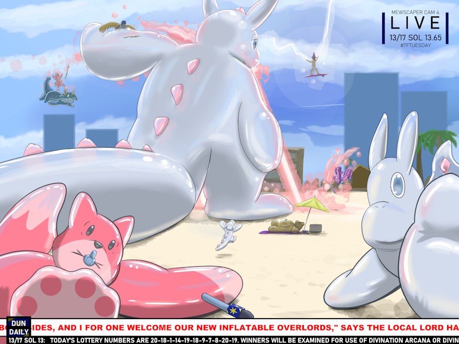 The summoned inflatable monster has begun its attack on the beach city of Dun! It's spraying down the denizens in its Flesh-to-Vinyl breath, transforming them into squeaky animal pooltoys!