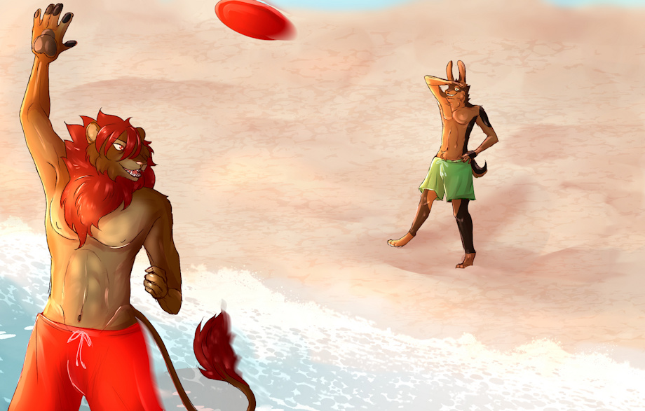 Rowen and Chiba are out on the beach catching the frisbee having a good time.