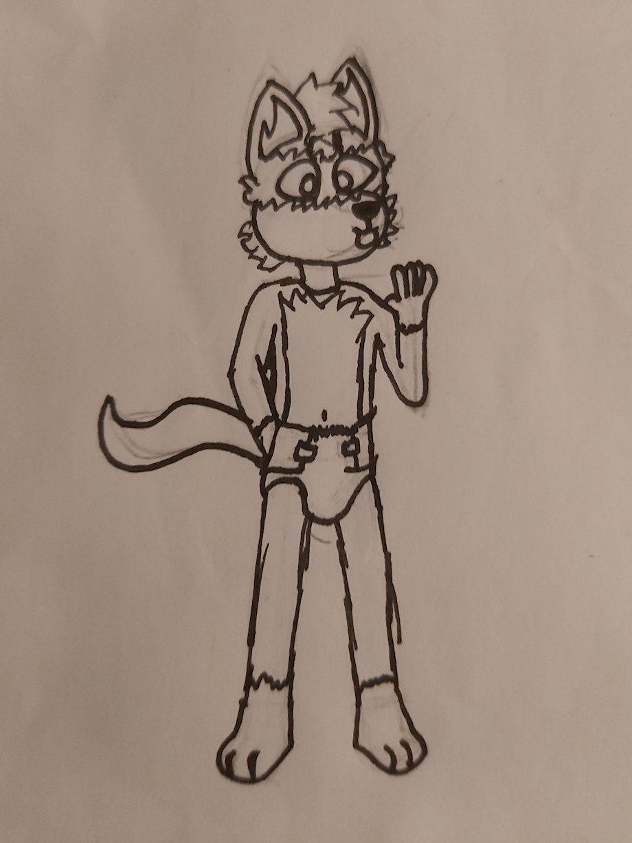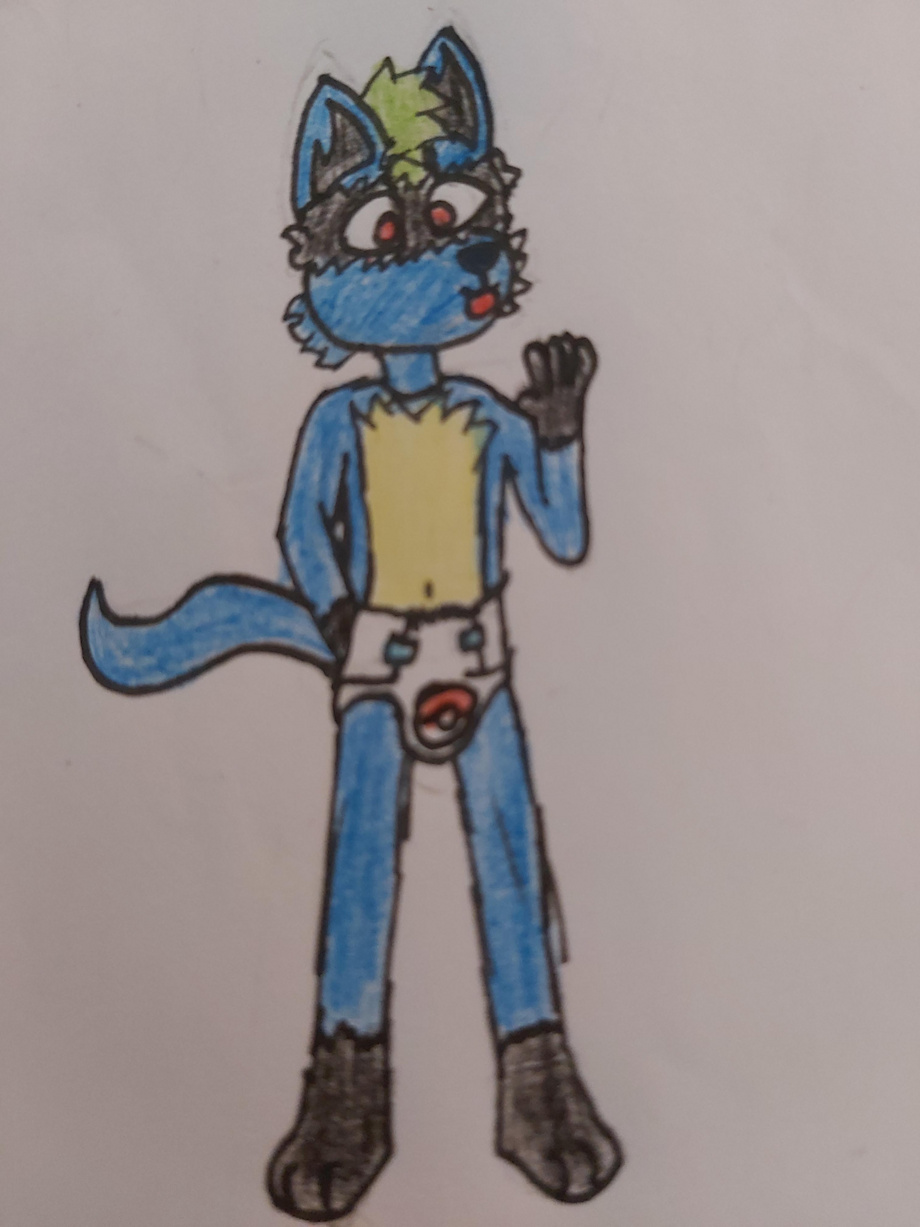 This is Riley! He's my new Lucario x Wolf hybrid! He's 10 years old and wears diapers for the fact that he's lazy!