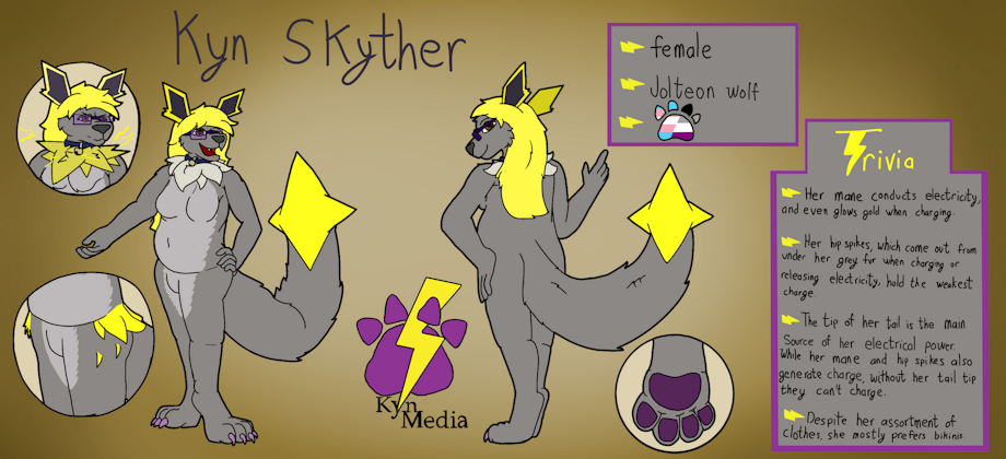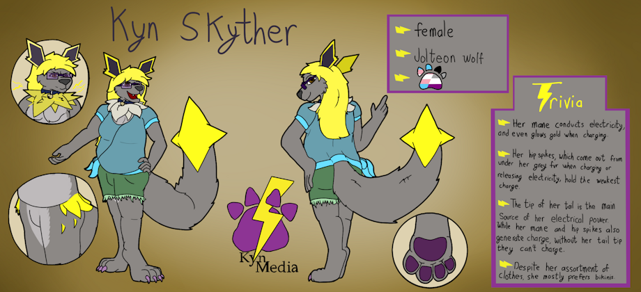 The star-shaped tip of Kyn's tail houses an electrical sac, the main source of her electricity. She could control said electricity to cause her tip to glow, spark, or even release it as a shocking attack or to create a temporary wall of electricity for defense. Her tail can also provide charge to electronic devices, with any manner of plug able to connect to her without issue. On that note, her electricity is non-leathal towards sentient creatures, causing only slight paralysis when releasing a full electrical attack. Her electricity can also surge through her body, allowing her to both power up her mane and hip spikes, as well as temporarily travel through her fur. Her tail can also absorb electricity too, giving her a boost in power and energy, though too much can confuse the girl for a short time. Also, here electricity and glow of her tail tip can also change colors depending on her health or emotions, like her tip turning blue when she's sick, or deep red when she's angered. Her tail also loses its glow when she's powered out or tired. When this happens, the electricity from her mane and especially her hips also lose their charge.