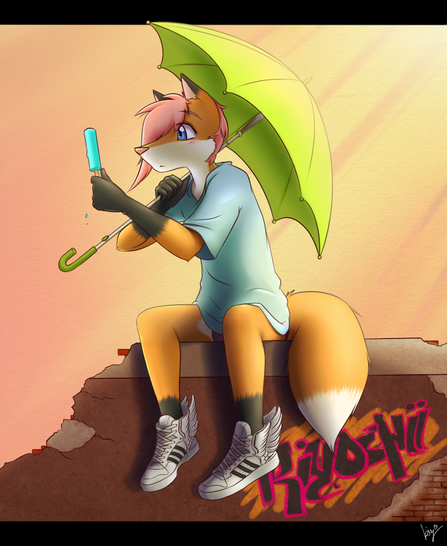 He's so cute. ^_^ I love the look on his face. "Popsicle....." I also enjoy his attire. Just kinda chillin in his shirt and underwear. With an umbrella. XD
