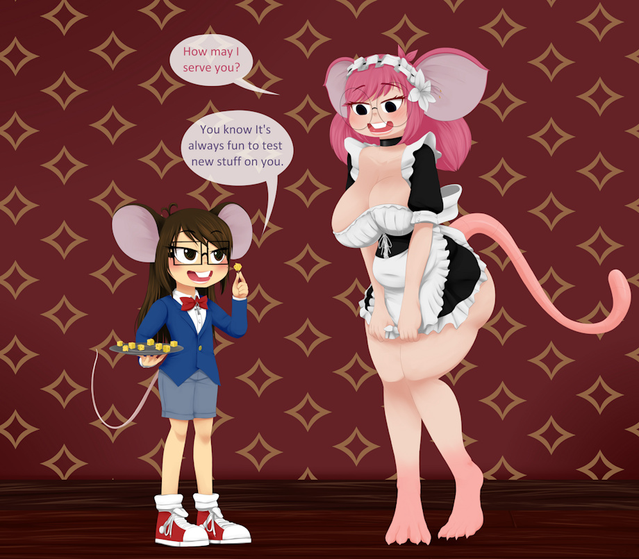 Rattybuns got turned into a chubby mombod maid, by me I think? She's hypnotized though, wait I'm a mousegirl now too? And a LITTLE ONE AT THAT?! And we have cheese too... Oh... Cheeeeese *Squeak*.