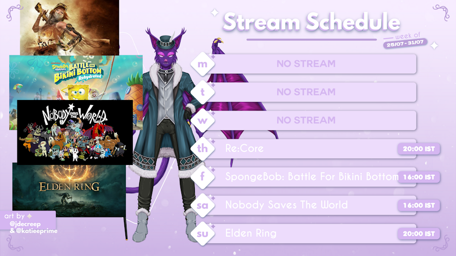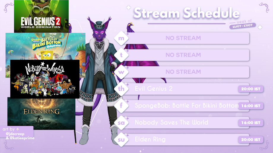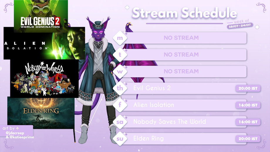 Here's my stream schedule for the week. Conquering the world in Evil Genius 2, another fetch quest in Alien Isolation, becoming a dragon in Nobody Saves The World & beating down giant snake boy in Elden Ring.