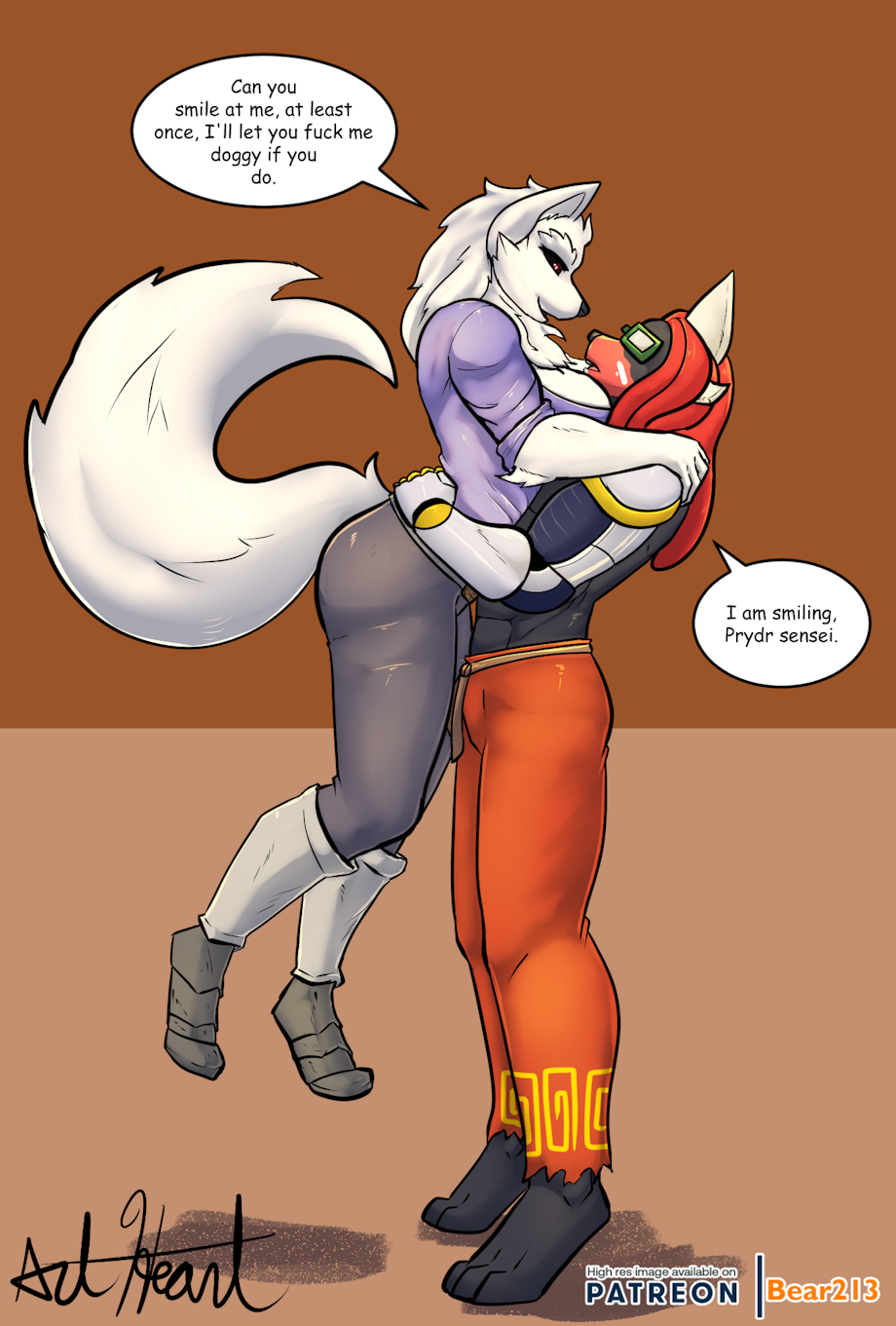 Passing out right now, but This image was granted to me by :iconFeretta: sensei. He allowed me to use his girl Prydr being picked up by Kuma. She may be tall, but so is he.