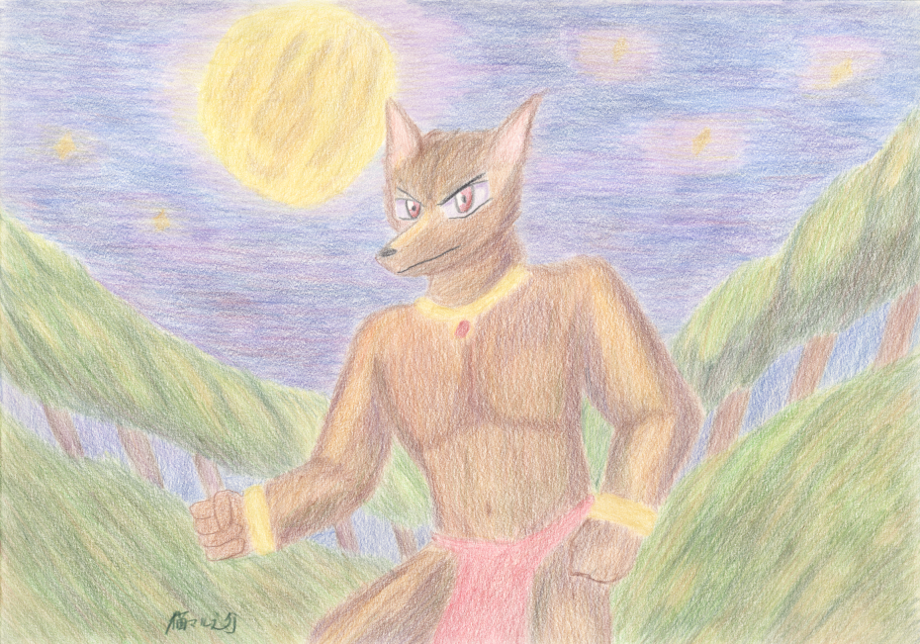 I draw a random rabbit male character with night background and I focus on the fullmoon, and I draw this art in 2004. on this art I draw a naked rabbit but his folded legs cover the whole part. now I see this art and I feel the pink and indigo color looks very good, and I like this tranquil mood.