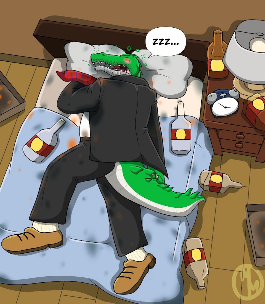 Seems like Cregon came home after a long day at work and late night drinking. This is basically how Cregon spends most of his days: Wake up, get dressed, go to work, work all day, drink booze the rest of the night, go home, and then go to sleep. It's not like there's anyone at home for him to take care of.