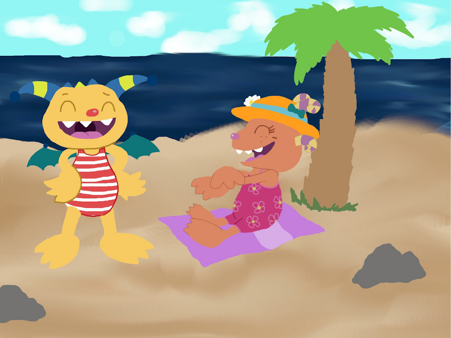 Donning some one-piece swimsuits, Henry and Gertie are ready to play on the beach.