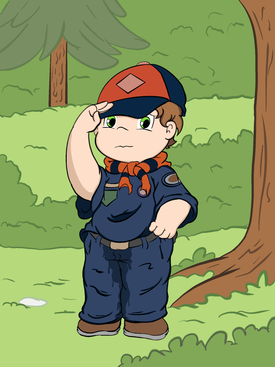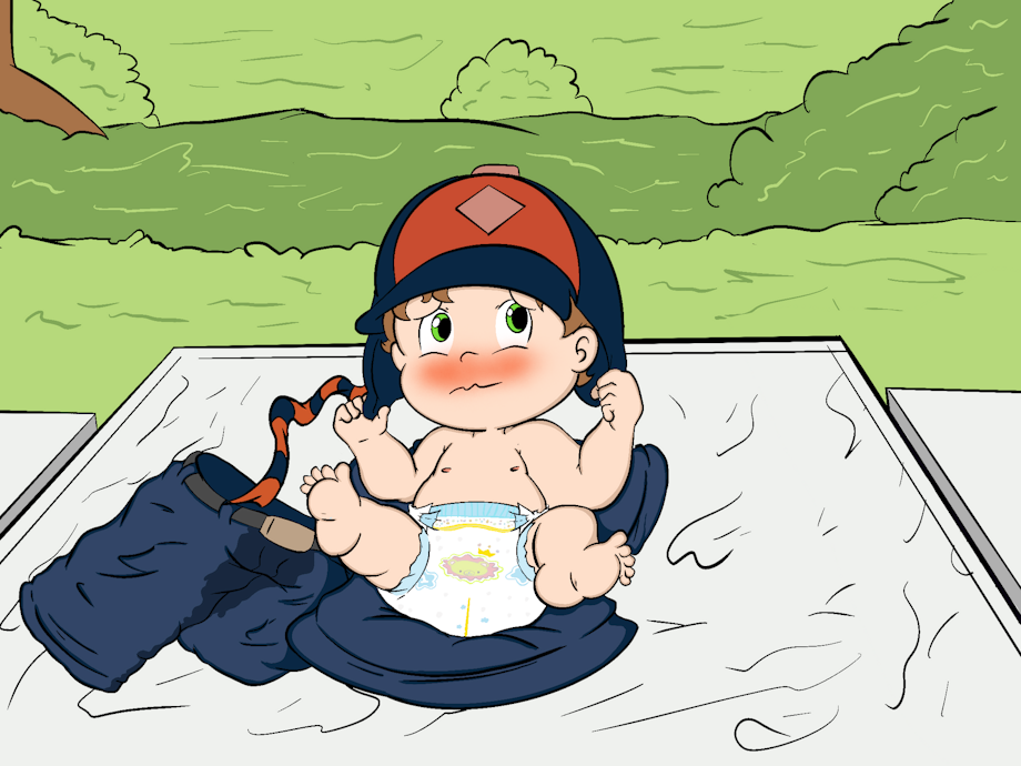 Charlie was an adult when the day started. He agreed to help his friend look after a group of Cub Scouts on a hike, but someone spiked his drinking water. Soon he began to regress more and more, until he could no longer fit in his clothes. Luckily his friend brought an extra uniform that fits him. However, he soon begins shrinking out of that too, having a little pants wetting accident. Now he finds himself being diapered as someone gets their diaper changing badge. X3