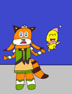 "A flying book? I thought oversleeping meant not being tired anymore," the raccoon said when suddenly, a chao spawned out and rammed into her head. The chao was yellow with a pink frilly collar around her neck, and two pink bows on each side of its head.