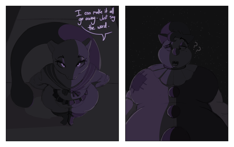 The mewtwo’s tail idly flicked to and fro. She paused for a moment, but otherwise stood as still as ever, continuing to stare upward at the clown-faced gengar. “How you hate the low pay and the extra favors it requires you to do so often. You know, the sexual favors. The ones that got you hired in the first place. It’s why you’re coming home so late tonight. You had to wait until the party was over, the children were away, and their father had an excuse to leave.”