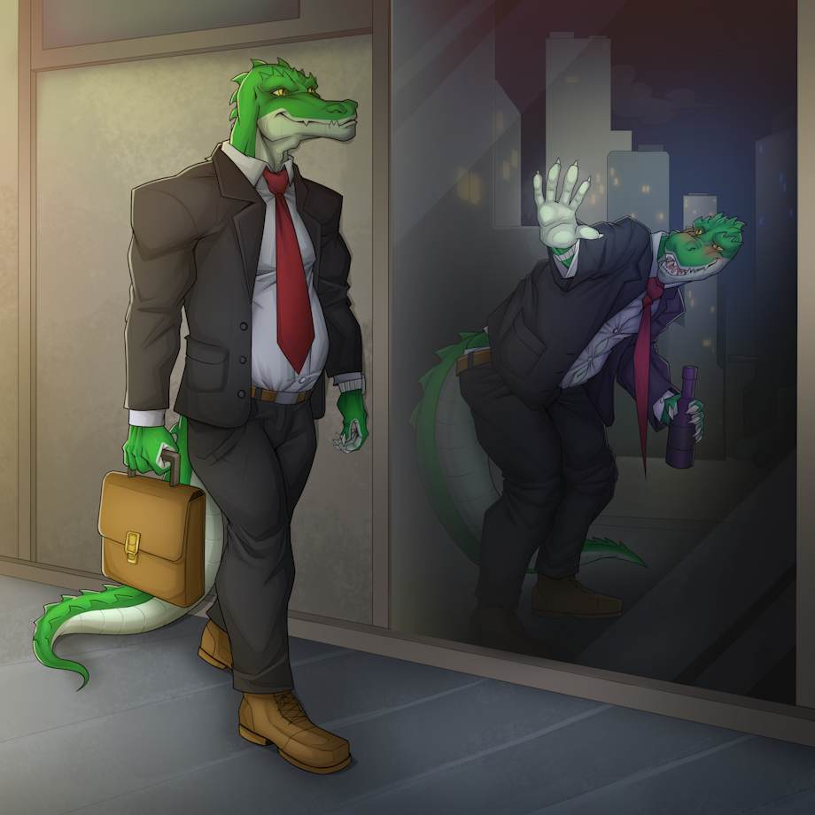 Here's Cregon dressed in his work clothes. There are actually two sides of Cregon: The Cregon his coworkers see and the real Cregon During the day he's a spiffy guy, always heading to work on time and is super organized But at night when he's off, he's a different person He's not the guy his workspace sees This is just an inside of Cregon