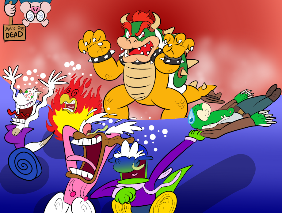 It's Bowser Day and Jolly and his friends are running from Bowser and even dragging Cregon with them.