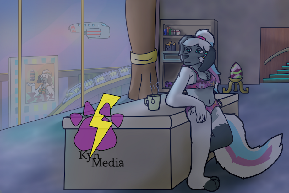 Yenlei looks out the window of her two-floor condo unit, staring at the neon-lit world she called home. Dressed in a flower print two piece bikini, and with her hair and tail dyed baby blue and violet pink, she took a sip of her mint tea before gently placing it on the countertop sat next to her kitchen. She noticed a TV billboard in the distance, an ad for a juice drink she had modeled for not too long ago staring back at her. She chuckled at the thought, as she fondly remembered that shoot fairly well. her hair and tail dyed to match the drink's color scheme, the rather catchy tune that played during the shoot that she had to dance to, to the several bottles of juice she had to drink to "get the money shot", most of which she opted to just bring home after rather than waste it, which now left her with a fridge full of several half drunk bottles, and of course, 3 very happy executives who were thrilled with Yenlei's performance. It was a huge success, and while the Furfrou had to work out a ton after, she was at least thankful to expand her repertoire further with these sorts of ads. It was an experience she did appreciate, exciting her for future projects her agent was lining up for her.