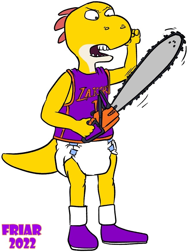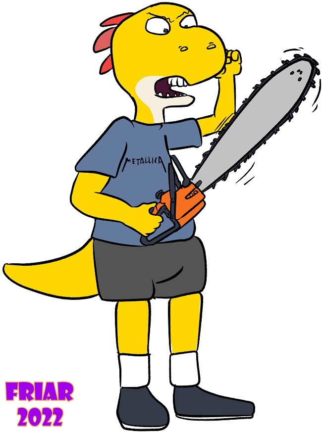 Showtime rocking out while revving his chainsaw, like Beavis in the Lawn and Garden episode of Beavis & Butthead.