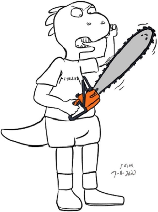 Showtime rocking out while revving his chainsaw, like Beavis in the Lawn and Garden episode of Beavis & Butthead.