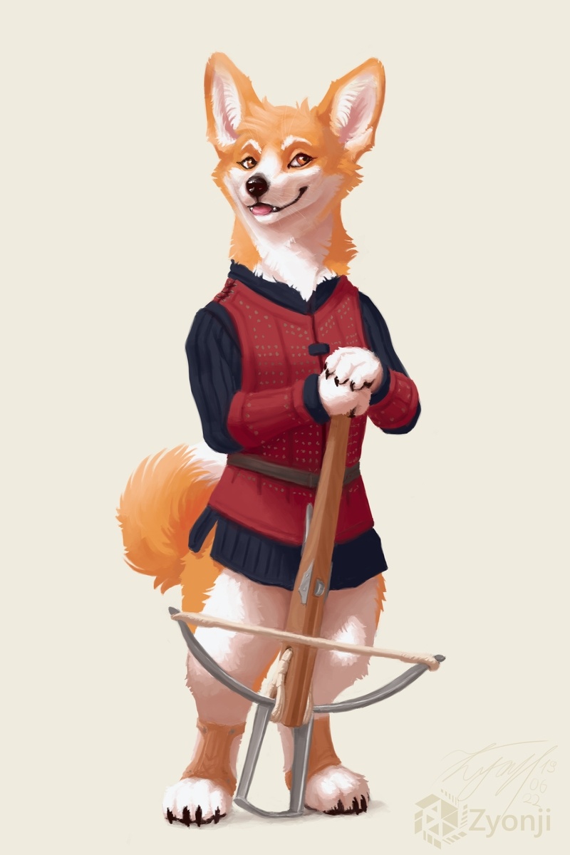 Another painting of Gwen, but this time it's the regular character painting commission format. I tried my best to portray the short limbs of corgis in the upright anthro anatomy. I like how cute it turned out. (: