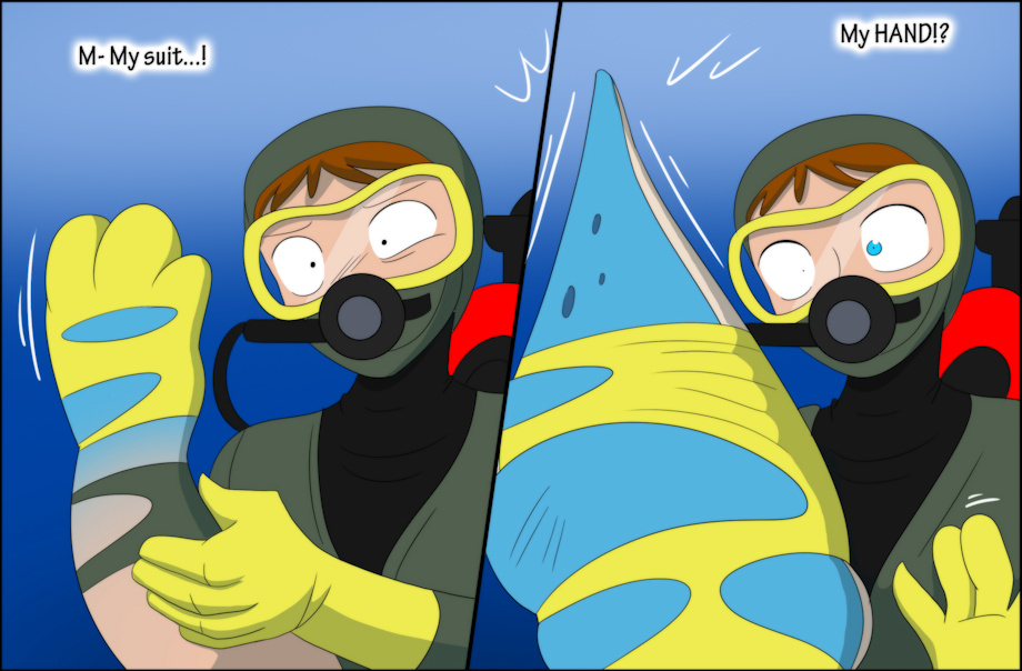 Holding my arm as it swelled and tore apart my suit, I lamented its destruction, even as a large flipper burst through my glove! I could only stare at this new, strange appendage, my eyes wide with shock!