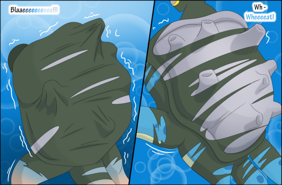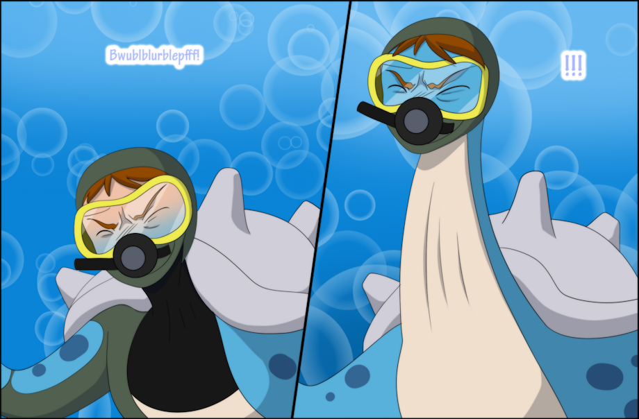 The leg of my diving suit and my bright yellow flipper struggled to contain the expanding limb inside, and as my changing limb pushed to get out, they finally burst to reveal the giant blue flipper of a Lapras!