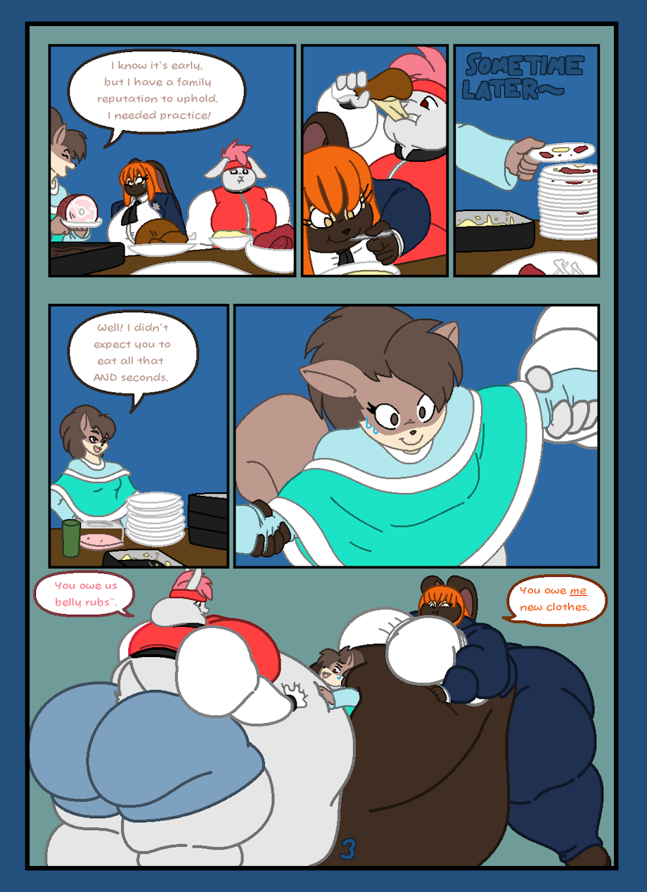 1- Sarah making a Full Breakfast for her favorite Buns. 2- The bunnies realising too late what Good Squirrel Cooking can do to one's figure. 3- Squirrel Sentenced to Snuggly Stockade. 4- Sarah enjoying her Thigh Throne, Queen of the fatties~.