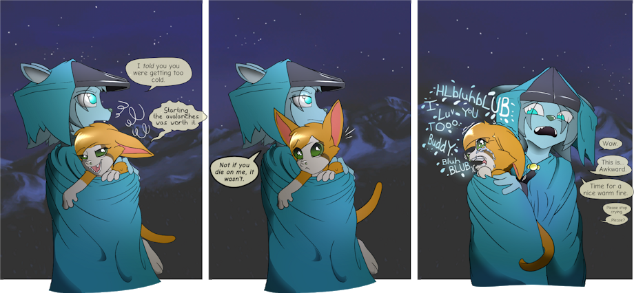 Good thing Fidget's still loopy from the cold- Dust might have to admit she's more than just a pet.