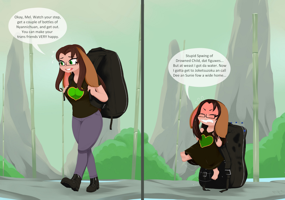BunnehWyld the road to hell is paved with good intentions, though I guess hell or not is on the eye of the beholder, Mel tried to fill a bunch of water bottles with Spring of Drowned Girl (娘溺泉 Nyannīchuan) in order to gift them to her transgender friends, careful not to fall into a spring herself, unfortunately she seems to have missed her step at some point, falling into the Spring of Drowned Child (童子溺泉 Tontsūnīchuan), now not even able to lift the bag she was carrying.