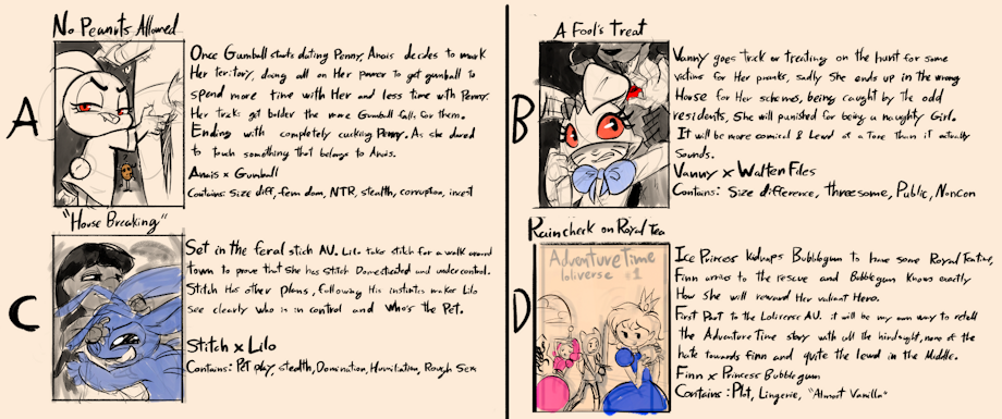 I crossed between A,C, and D those three are all in my favorite fandom and has a flavors of all the stuff I like. Oh please tell me you'll save the ones that don't win for a later time. Still I'm so excited for your next big project dude great work!