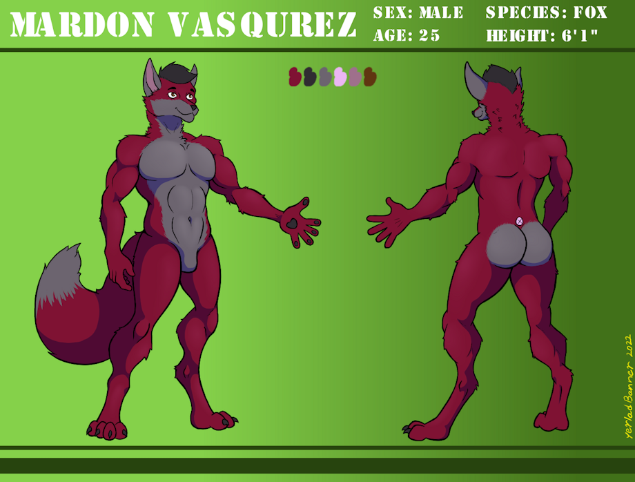 Dark gray and dark red fur. Brown eyes. Height of 6'1". Athletic.