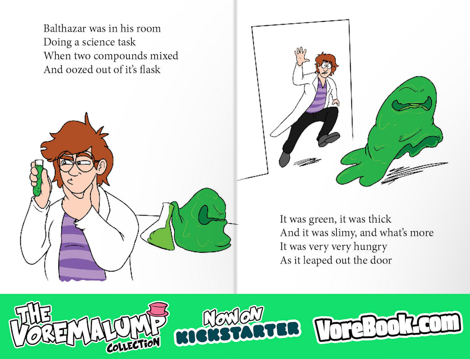 Get a big 136 page book of this and other stories on Kickstarter now! http://vorebook.com Balthazar and the Gobbledegoop is a parody of Bartholomew and the Oobleck, where a scientist creates a voracious green blob that absorbs all the hot guys in town!