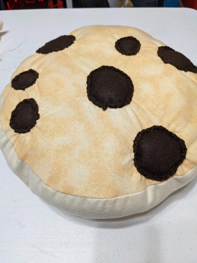 So I made her a cute little chocolate chip pancake pillow for her to cuddle. It's pretty large too! Like, over a foot long and a good bit thick because I tend to over stuff my plushes. Though that worked out just great so she can cuddle it well. <3