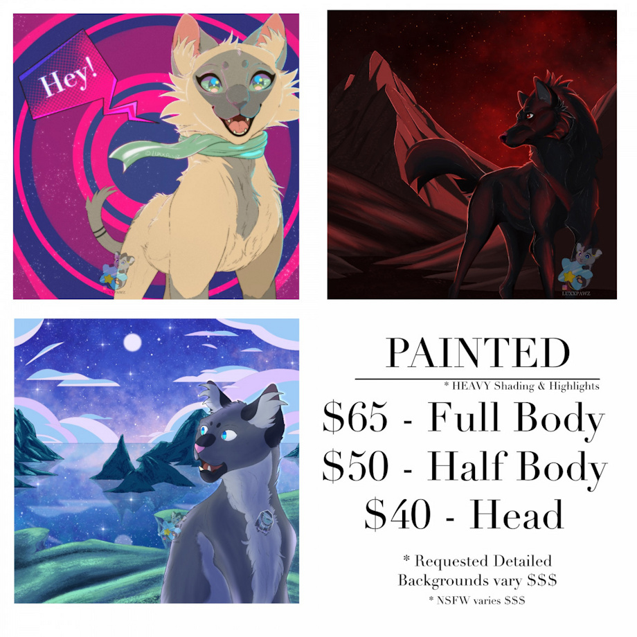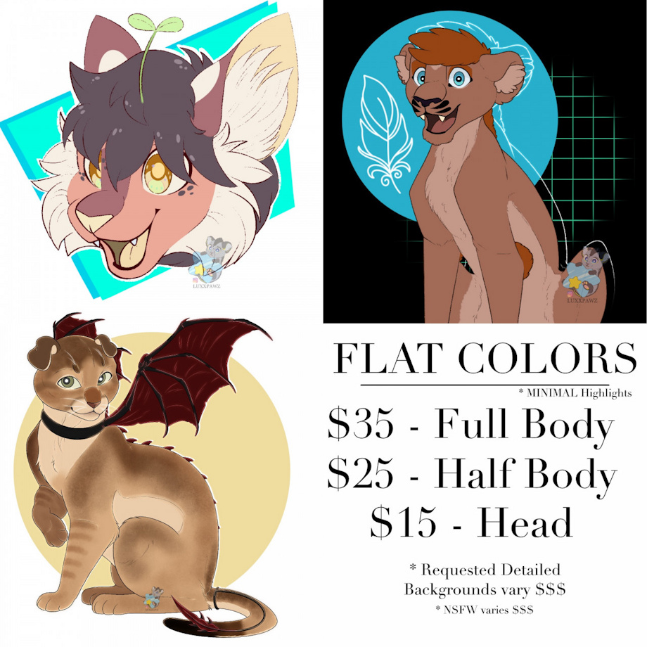 Keeping all of these sweet and short! These contain order information for flat colors, detailed shading and highlights, and reference sheets. I generally take at least two days to complete an order and I