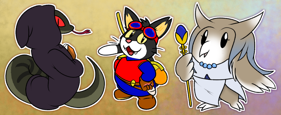 Just a trio of animals I colored for our D&D sessions the last week or two. :3 An evil snake in a coat, carrying a mysterious gem. A heroic cat with a white tail tip who wears colorful clothes (in a funny pose, huhuh.) And an angelic old owl, hoo maybe I didn't make look old enough... but she's old! I'm pretty bad with the names and details so, I'll just show the designs!