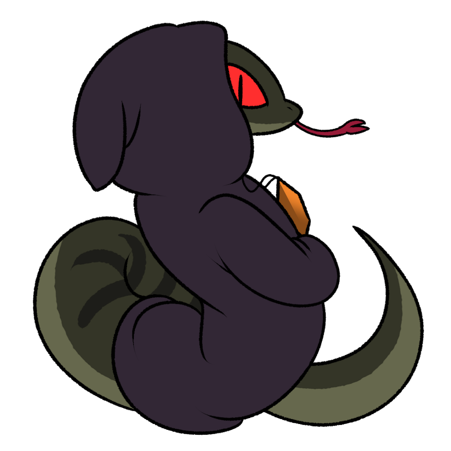 Visual Description: A dark green snake, with arms, turning their back to the viewer, and they wear a dark coat and hood around the upper half of their body. They have an orange gem on their necklace, red evil snake eyes, and a tongue poking out. In the center is a black and white cat I posted on twitter last week, who's doing a meme-y Mario 64 pose, wearing bright red and blue clothes, so she looks very Mario-like. On the right is a white and dull-tan colored owl who looks like a goddes, in white robes, with long blue-ish gray hair, and a white beak and face, who's holding a gold staff.