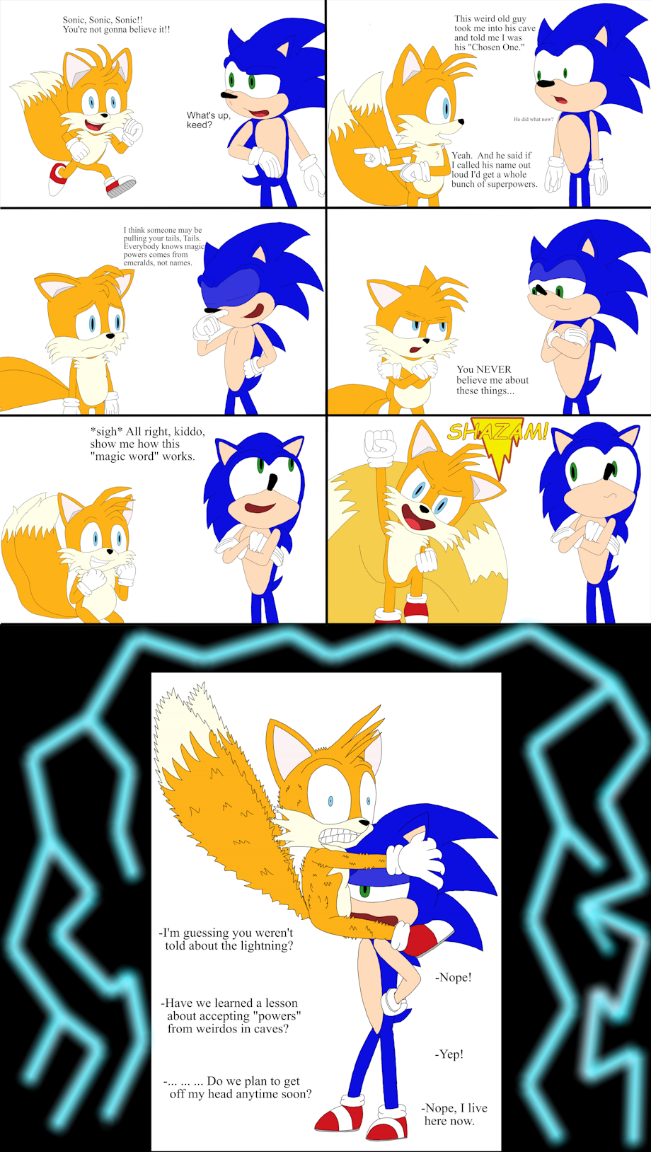 I've never actually seen the original meeting between the Wizard Shazam and Billy, but it always strikes me as odd in every remake the guy never seems to mention that Billy's new powers are going to be delivered via lightning bolt. I think I'd probably have a few choice words for him after the fact. Of course for someone like Tails who has a fear of lightning and is fast enough to dodge it, this would probably be a touch traumatic.
