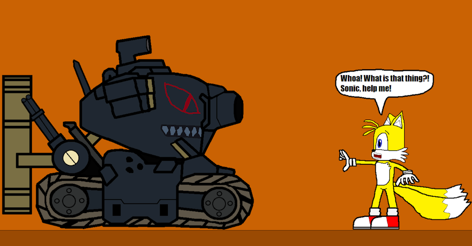 Tails turns around and sees a scary black tank (Metal slug Ptolemaic Army's version), Tails shocked and shivering in fear yells for help before the Blackhound procceeds to slaughter Tails.
