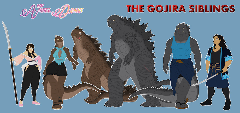 My current design for Godzilla and his sister, my Oc, Jira. As Kaiju, anthro and human/gijinka