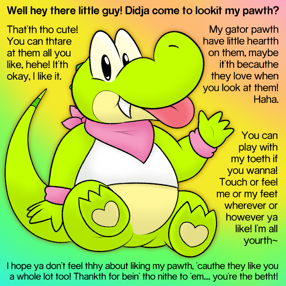 Visual Description: Color art of Gaydar sitting down, showing his paws, which have a heart-shaped print under each of them. He's smiling happily with a bunch of text, quoted below! "Well hey there little guy! Didja come to lookit my pawth?" "That'th tho cute! ou can thtare at them all you like, hehe! It'th okay, I like it." "My gator pawth have little heartth on them, maybe it'th becauthe they love when you look at them! Haha." "You can play with my toeth if you wanna! Touch or feel me or my feet wherever or however ya like! I'm all yourth~" "I hope ya don't feel thhy about liking my pawth, 'cauthe they like you a whole lot too! Thankth for bein' tho nithe to 'em.... you're the betht!"