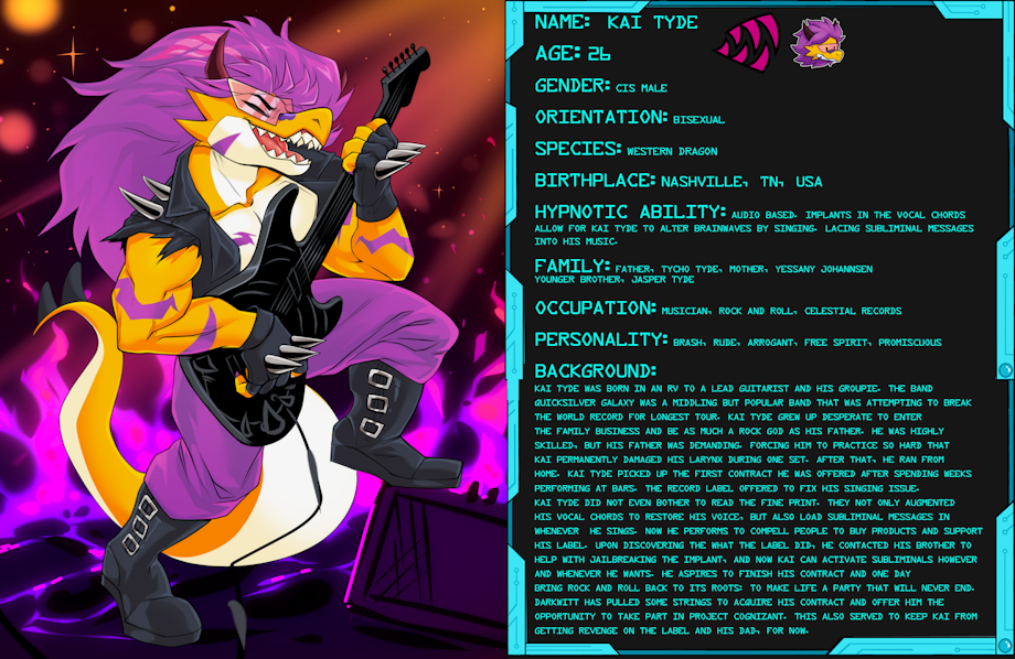 Meet the first of the Leaders of Project Cognizant: Kai Tyde the Rocker Dragon. In truth, he could sing any genre he wants, but the call of the yesteryear of the 80s sings true in this one. If he wins, he aims to turn all of Cognizant into one big party: A Utopia of rock.