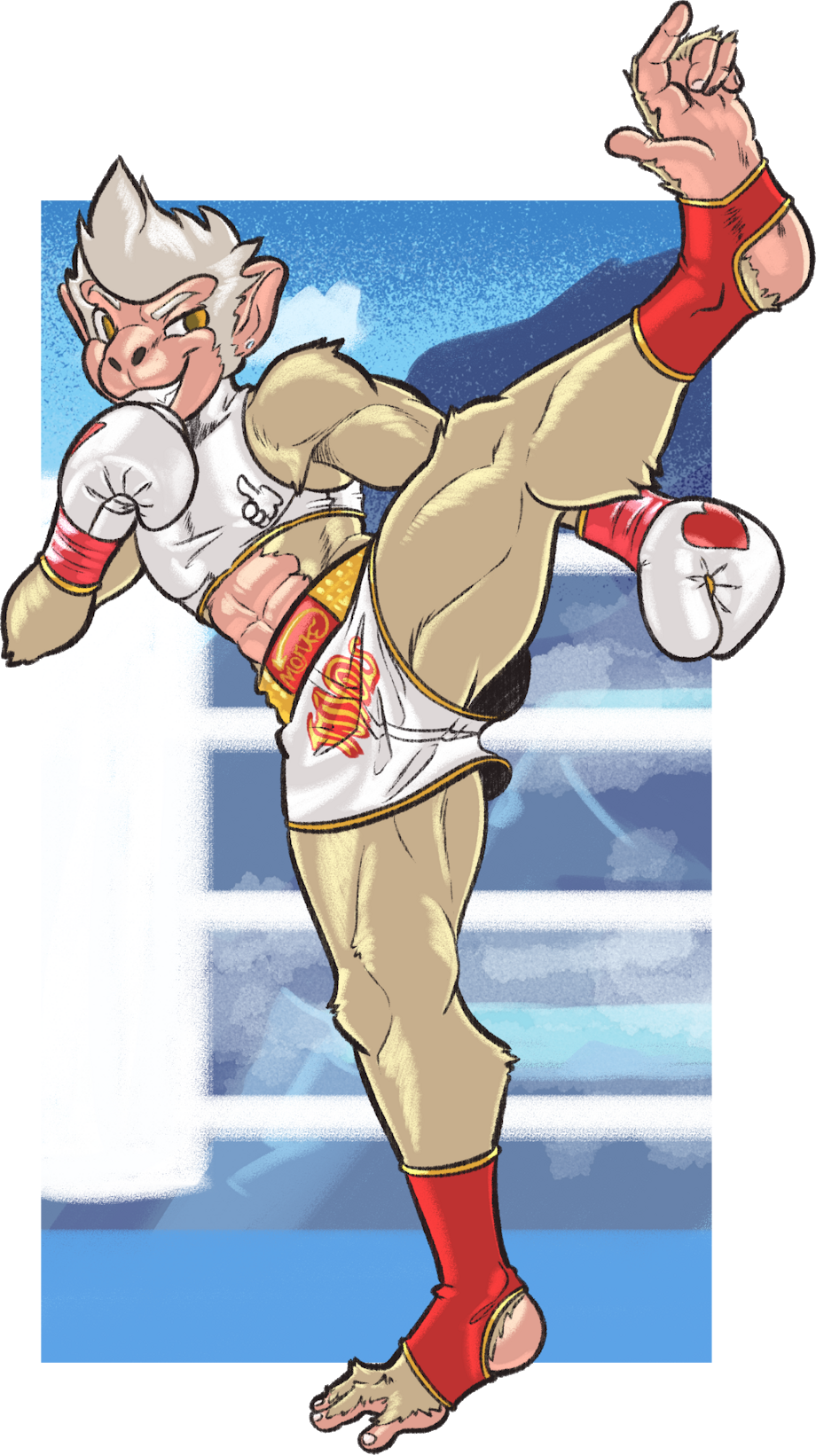 A colored stylestuff comm featuring the commissioner's Sunny doing a kick, in a monkey-like fashion.