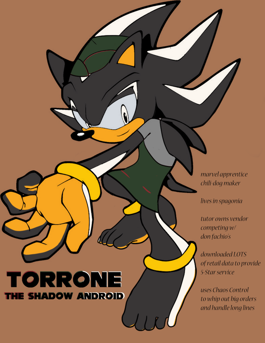 Torrone isn't a complete Shadow Android, meaning he lacks certain abilities. He cannot perform offensive forms of Chaos Control, only the base form to slow down time if things get busy or there is a crowd. Since he is barefoot, his running speed is slower than the likes of Sonic and his fellow androids, but he is still incredibly quick and has lightning-fast reflexes.