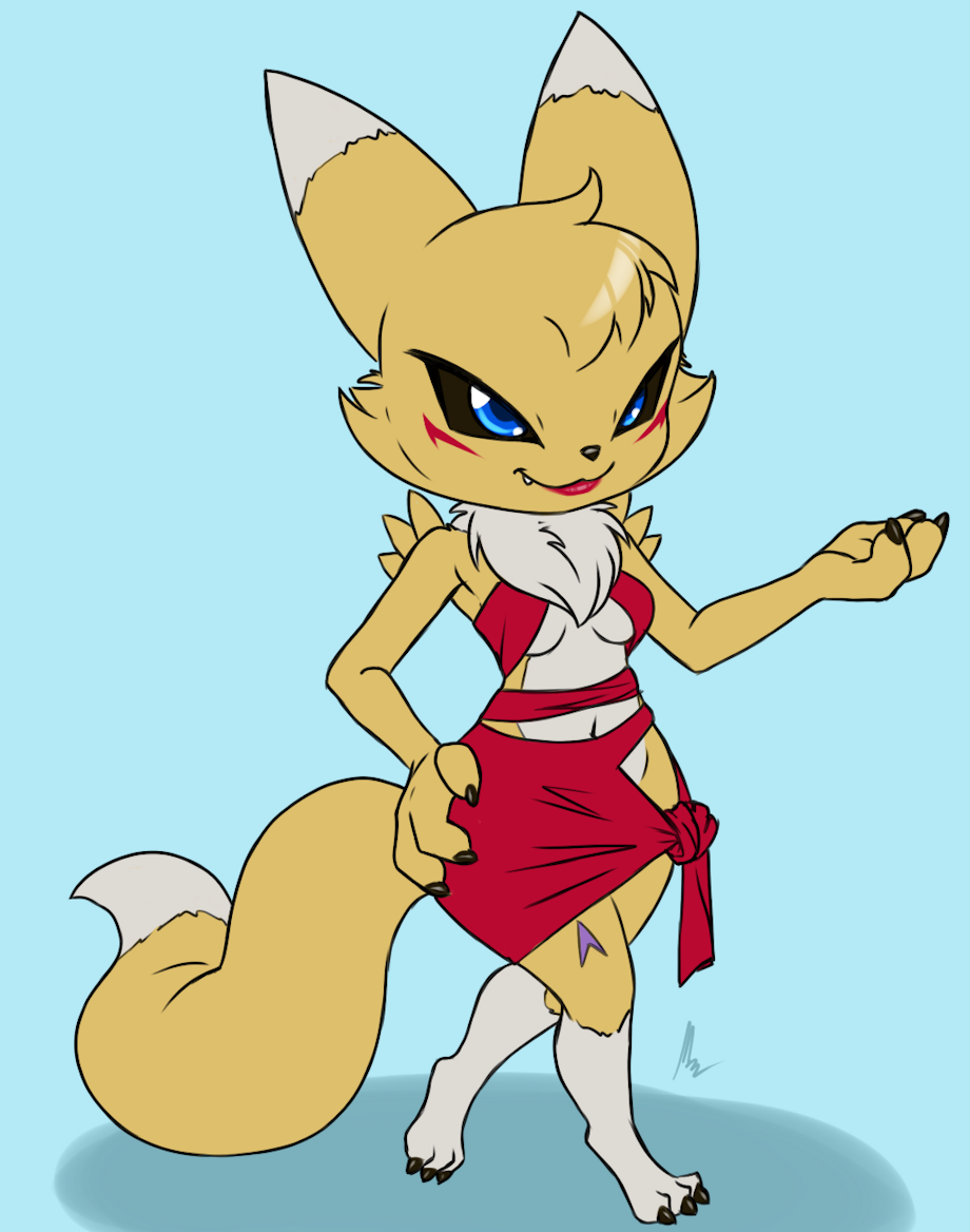 Stream commission for frostwofl300, of their renimpmon OC in a fancy dress.