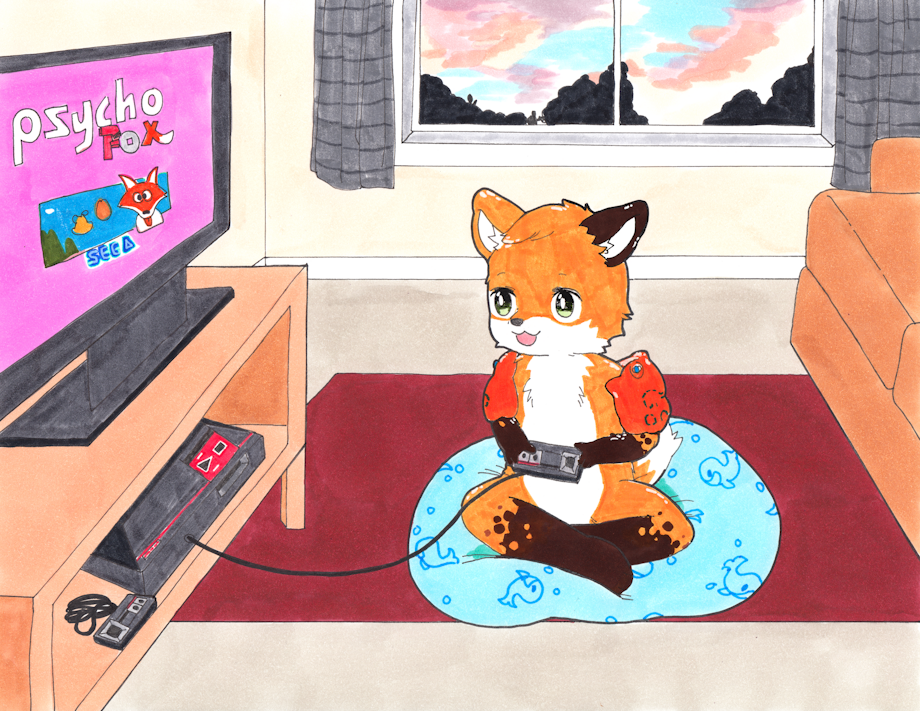 What is the best a seamonstah can do after a long day of splashing on a hot summer day? Running into the living room, turning on the SEGA Master System and start playing Psycho Fox!! Of course Jaby plays with his Schwimmflügel on, he had no time to change anything! Also of course he plays on a Model 1 cause they are fun c: