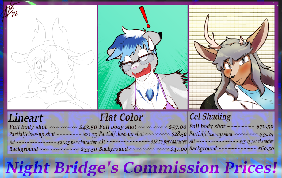 Hello! As of today, my prices have increased; The actual prices are listed above! I will be posting notifications in my Journal whenever I am open for commissions! If you are interested or have questions, be sure to note me, and I'll list you in advance for when I open!