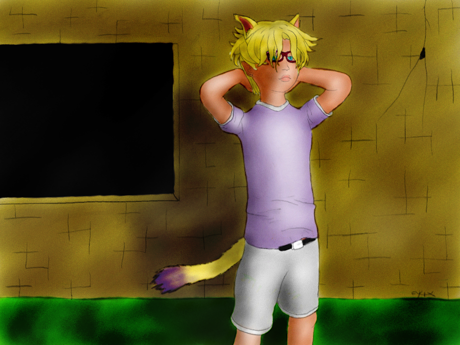 A neko boy just standin' around in-front of a brick building.