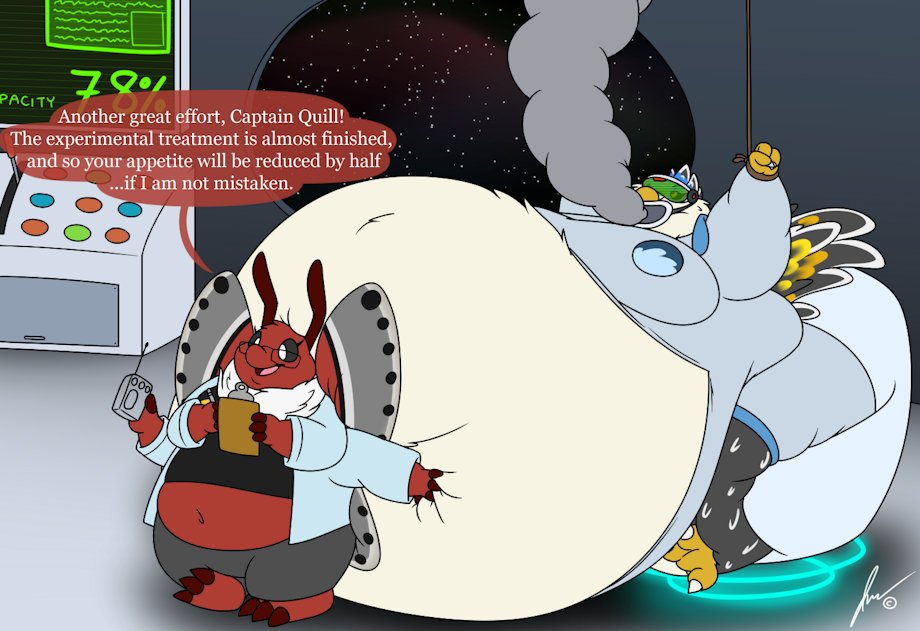 Vikki is made contact by the crew of a spaceship to try to help their captain with her problem of.... huge appetite. Hearing this, Vikki was happy, because it came at the right time because she just thought of a therapy that can control the appetite. She accepted and was teleported to the ship. After a few minutes walking, she met their Captain: Captail Quill. Immediately, she guessed the captain's appetite problem with its obese body and the number of food packages lying on the floor. She knew what she had to do. Vikki brought Quill to their test room to conduct her therapy. The scientist asks the captain to sit on this chair, and then tie it up. She shaved that big avian that everything is fine, that she will just put a pipe in her mouth, where will flow food that she will have to eat and swallow, while relaxing with cartoon shows that will play in these holographic glasses. Her crew has given this info that their captain is the type to stress a lot, which makes her eat a lot. Also, she loves cartoon. So, with all this info, Vikki will be able to start this therapy well.