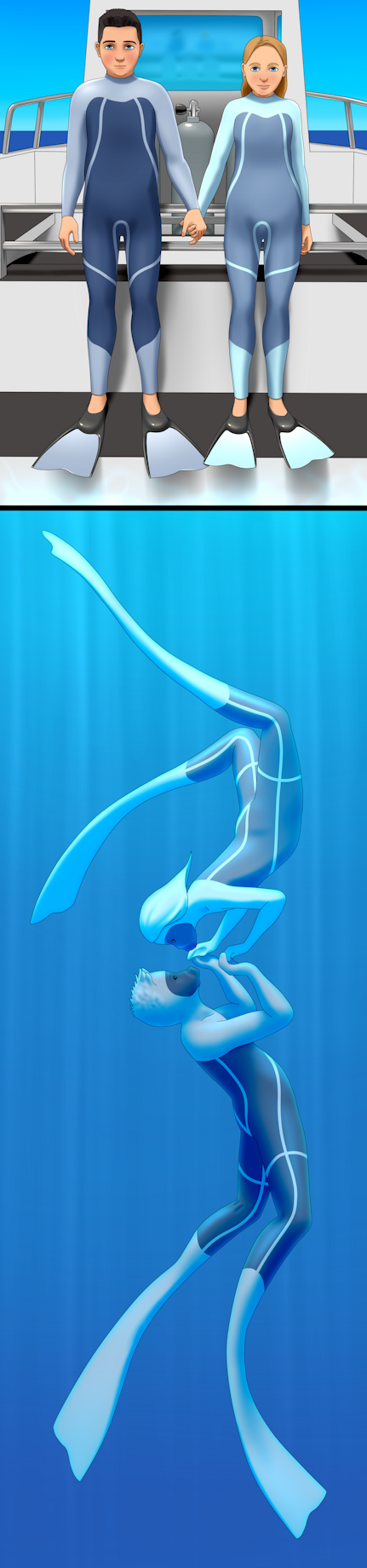 These two, went for a very special dive. The aquatification suits transform their gear and bodies, becoming a second skin and allowing them to be aquatic naturals that can breath the water and swim unencumbered. In this form they cannot stay on land, as they cannot remove their fin, nor have any heal or foot with which to walk on. Depending on the type of aquatification, this is either permanent, or the suit transform back once they are dry.